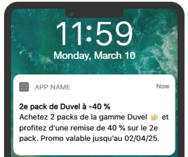 A Push Notification is sent to a specific target, limited to 100.000 contacts. It's ideal to highlight an existing promotion and in combination with other channels to boost performance results.