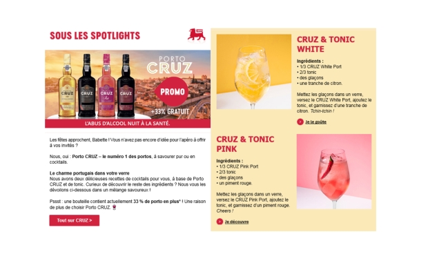 The campaign for La Martiniquaise and its porto brand Cruz focused on a packaging rebranding to modernize the product's image. The previous vintage-style design was no longer aligned with the tastes of younger consumers. To support the brand refresh, Cruz launched an email campaign featuring trendy and easy-to-make cocktail recipes—such as the "Cruz & Tonic," a playful twist on the classic gin and tonic. Positioned as a refreshing alternative to the traditional glass of port, the Cruz & Tonic also served as a festive aperitif, helping to introduce the brand into more modern and social consumption moments.